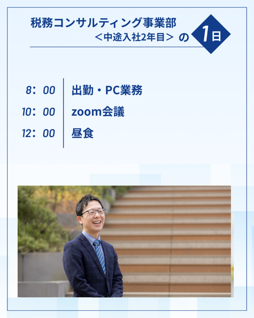 今回は、税務コンサルティング事業部〈中途入社2年目〉1日の流れをご紹介いたします!